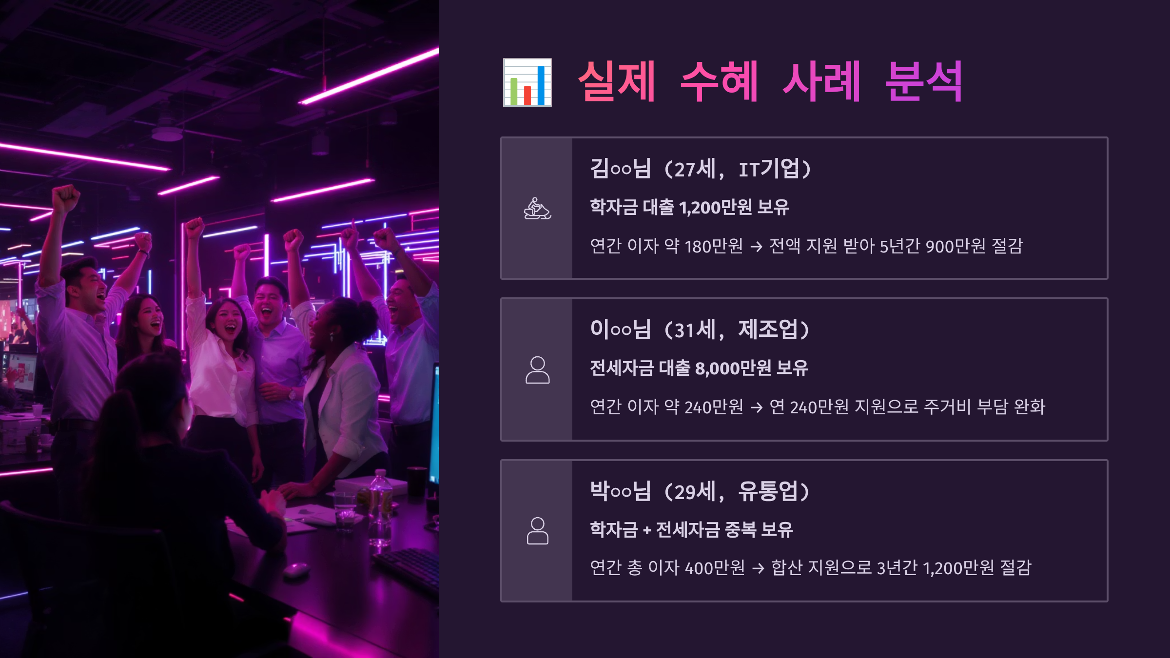 실제로 지원받은 분들의 생생한 사례를 소개해드릴게요. 서울에서 IT 스타트업에 다니는 28살 김민수 씨는 학자금 대출 4천만 원과 전세자금 대출 8천만 원이 있었어요. 월 이자만 45만 원이 넘어 생활이 빠듯했는데, 이 제도를 통해 월 12만 5천 원을 지원받게 되었어요. 5년간 총 750만 원을 절약할 수 있게 된 거죠. 그 돈으로 자기 계발과 저축을 시작했다고 해요. 📈
