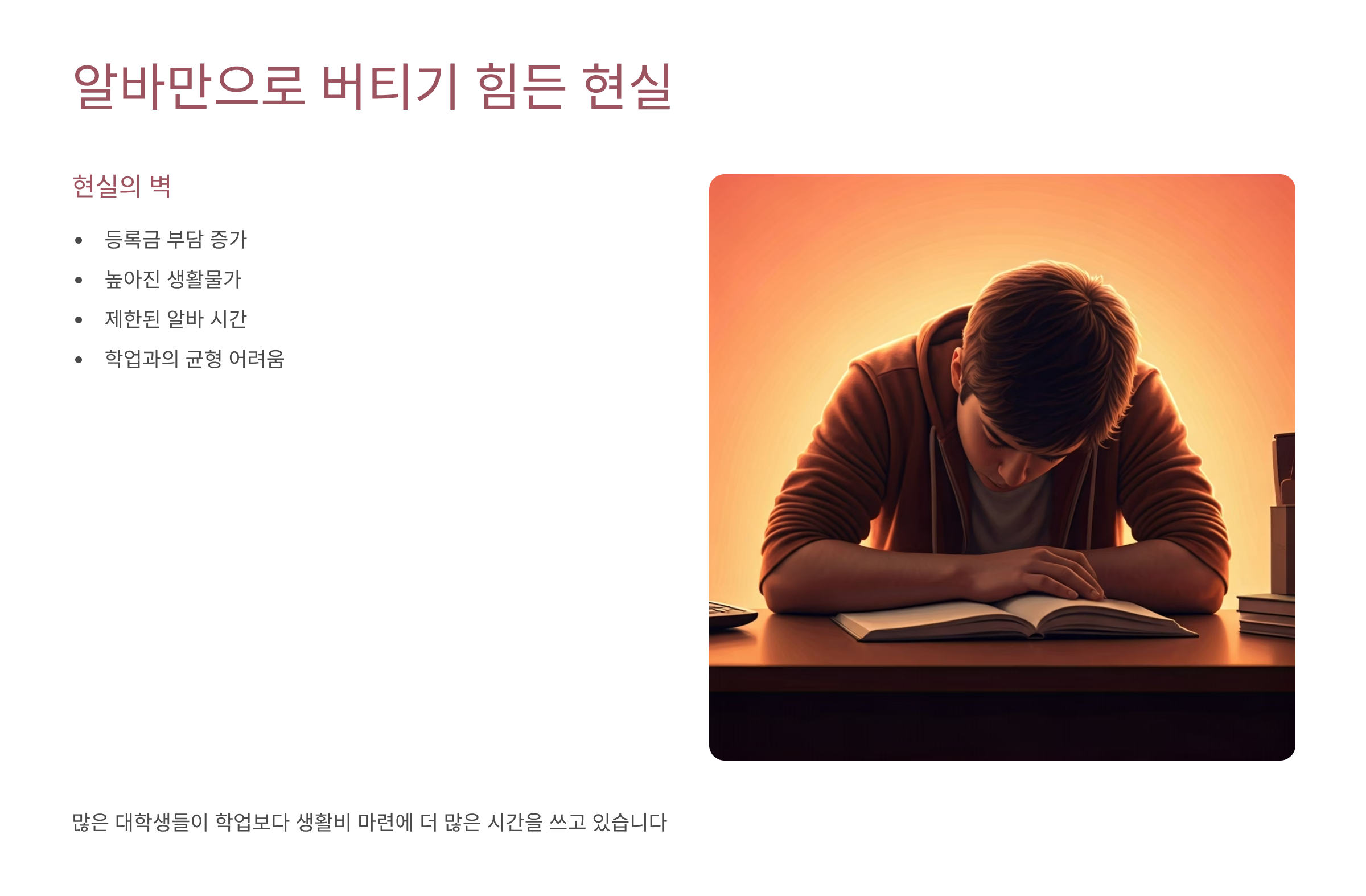 특히 코로나19 이후 경제 상황이 어려워지면서 부모님의 경제적 지원이 줄어든 가정이 많아졌어요. 이런 상황에서 학생들은 스스로 생활비를 마련해야 하는 부담을 안게 되었죠. 알바와 학업을 병행하다 보니 충분한 수면을 취하지 못하고, 제대로 된 식사도 하지 못하는 경우가 늘어나고 있어요.