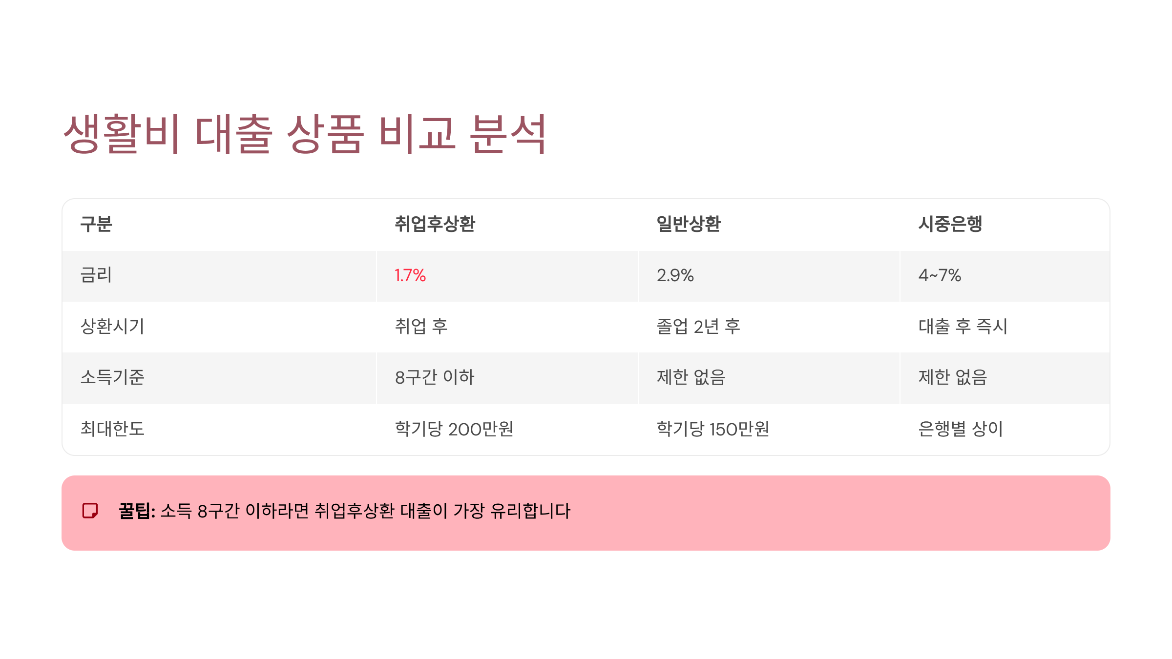 | 추천 대상 | 취업 전 부담 최소화 | 소득 9분위 이상 | 저소득층 학생 |