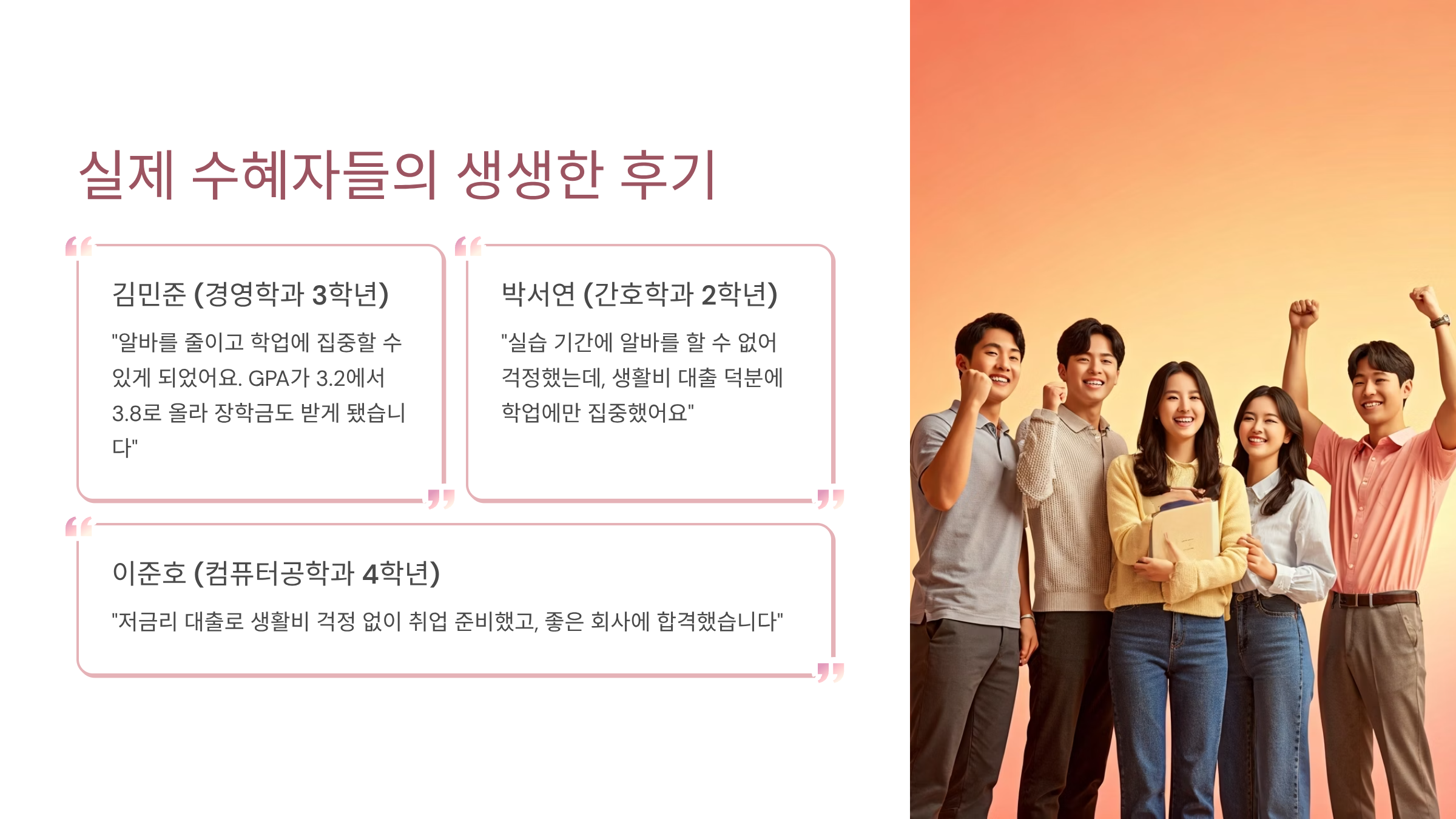 선배들의 경험을 보면 생활비 대출이 정말 실질적인 도움이 된다는 걸 알 수 있어요. 막연한 두려움 때문에 신청을 망설이고 있다면 한번 용기를 내 보세요. 지금 잠깐의 결정이 대학 4년을 완전히 바꿔놓을 수 있어요. 더 알찬 대학 생활, 더 나은 취업 결과로 이어질 거예요.
