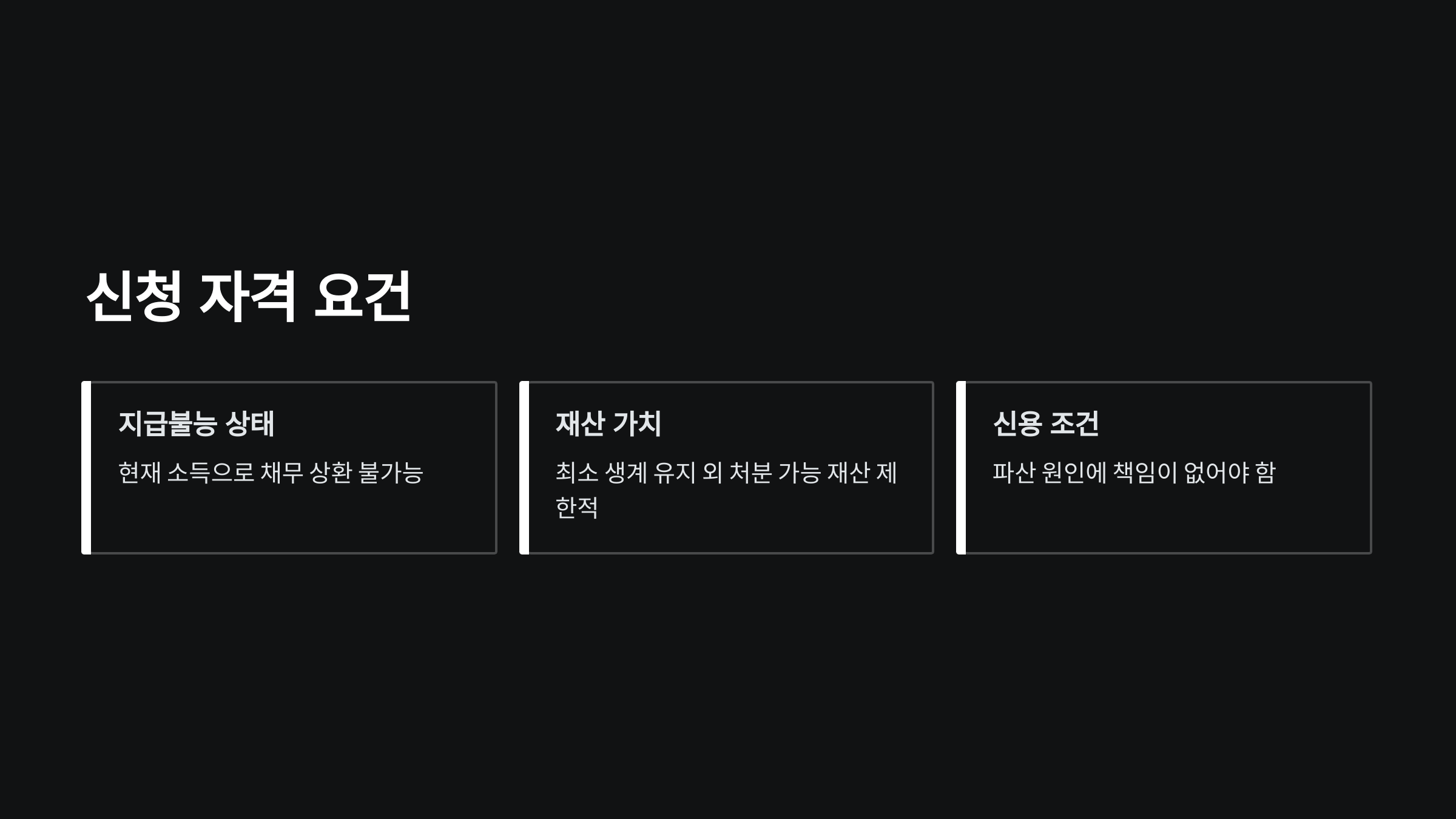| 지급불능 상태 | 수입 < 생활비 + 채무상환 | 3개월 이상 지속 |