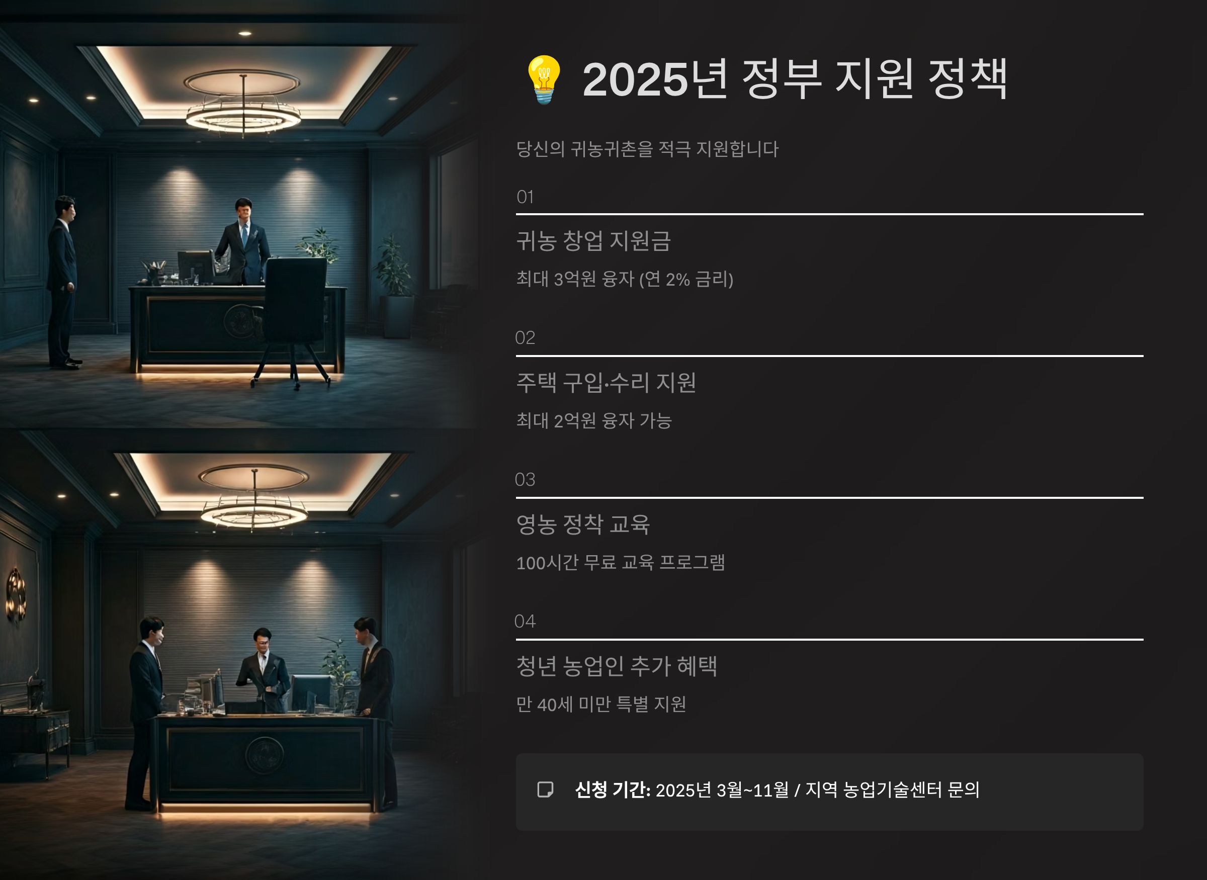 | 청년 귀농 정착 지원금 | 2025년 2월~3월 | 예산 소진 시 조기 마감 |