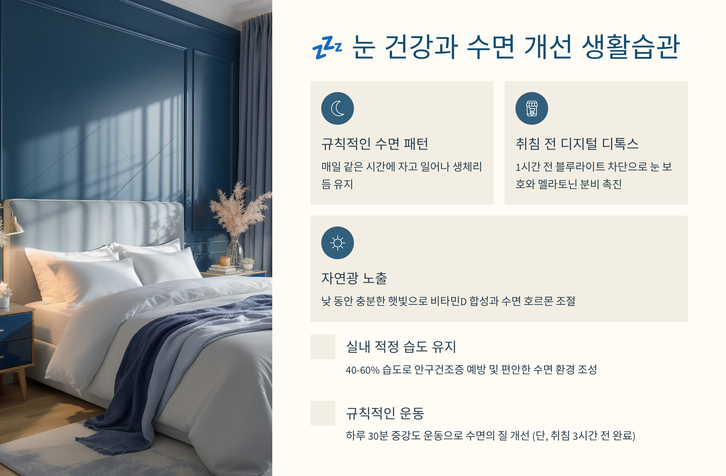 ⚠️ 면책조항: 이 글의 정보는 일반적인 건강 정보 제공을 목적으로 하며, 의학적 조언을 대체할 수 없습니다. 개인의 건강 상태는 각자 다르므로, 눈 건강이나 수면 장애와 관련된 증상이 지속되거나 악화되는 경우 반드시 전문 의료진과 상담하시기 바랍니다. 2025년 1월 기준 정보이며, 의학 지식은 계속 발전하므로 최신 정보를 확인하시기 바랍니다.