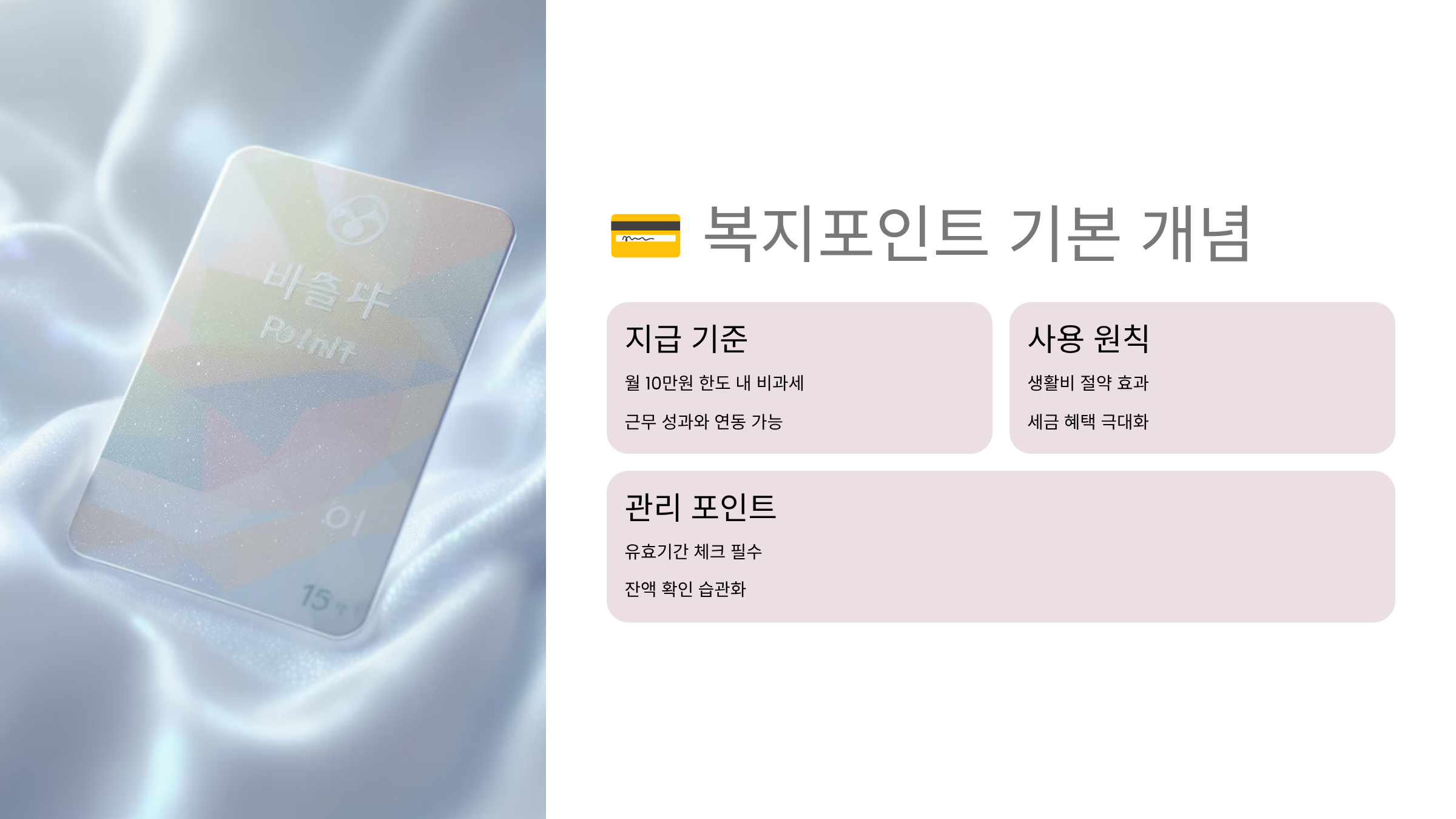 복지포인트의 가장 큰 장점은 개인의 필요에 따라 자유롭게 사용할 수 있다는 점이에요. 회사에서 일괄적으로 제공하는 복지와 달리, 본인이 원하는 분야에 집중적으로 투자할 수 있죠. 이제 복지포인트를 제대로 활용해서 2025년을 더욱 풍요롭게 만들어보는 방법을 자세히 알아볼게요! 😊