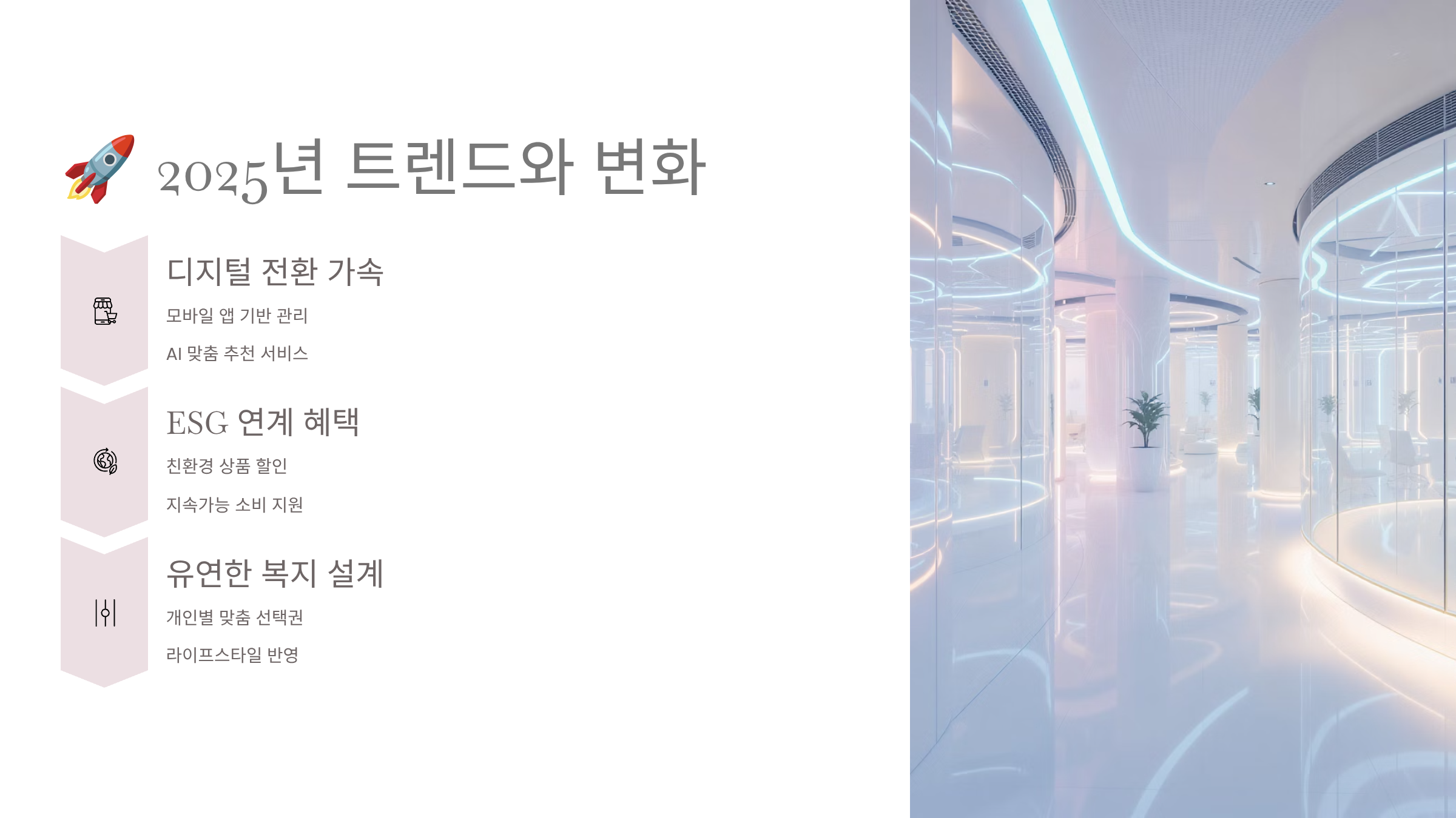 2025년은 복지포인트가 단순한 복리후생을 넘어 직원 경험(Employee Experience)의 핵심 요소로 자리 잡은 해라고 할 수 있어요. 앞으로는 더욱 개인화되고 다양해진 복지포인트 서비스가 등장할 것으로 예상되니, 변화하는 트렌드를 잘 파악해서 최대한 활용하시길 바라요! 🚀
