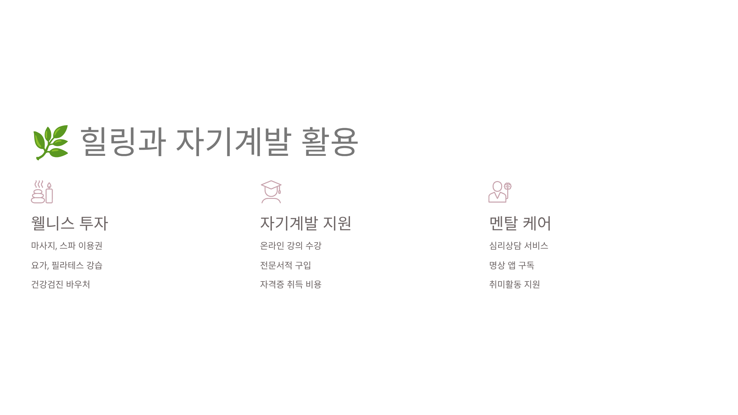 복지포인트를 힐링과 자기 계발에 활용하는 방법은 정말 다양해요! 2025년 트렌드는 '웰니스'와 '리스킬링'이에요. 단순한 휴식을 넘어 몸과 마음의 균형을 찾고, 미래를 위한 새로운 역량을 개발하는 데 복지포인트를 활용하는 직장인들이 늘어나고 있답니다.