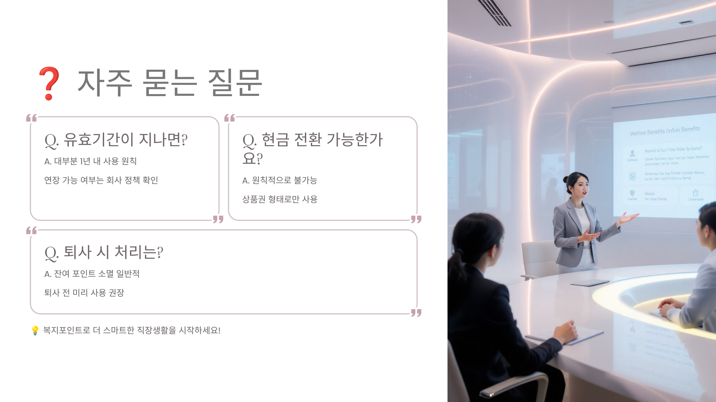 A3. 회사 규정에 따라 다르지만, 대부분 퇴사일까지 사용하지 않은 포인트는 소멸돼요. 일부 회사에서는 퇴사 예정자에게 1-3개월의 유예기간을 주기도 합니다. 퇴사 계획이 있다면 미리 포인트를 사용하는 것이 좋아요.