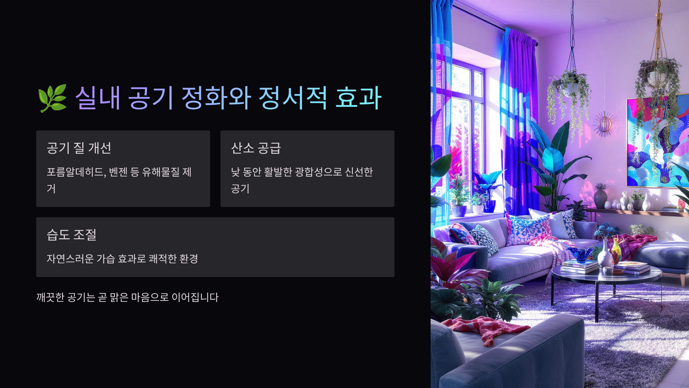 실내 공기 질은 우리 건강과 정서에 직접적인 영향을 미쳐요. 현대인은 하루의 90% 이상을 실내에서 보내는데, 실내 공기가 실외보다 2-5배 더 오염되어 있다는 사실 알고 계셨나요? 식물은 천연 공기청정기 역할을 하면서 동시에 우리 마음까지 정화시켜 준답니다. WHO 연구에 따르면 실내 식물이 있는 공간에서 생활하는 사람들의 호흡기 질환 발생률이 23% 낮았다고 해요.