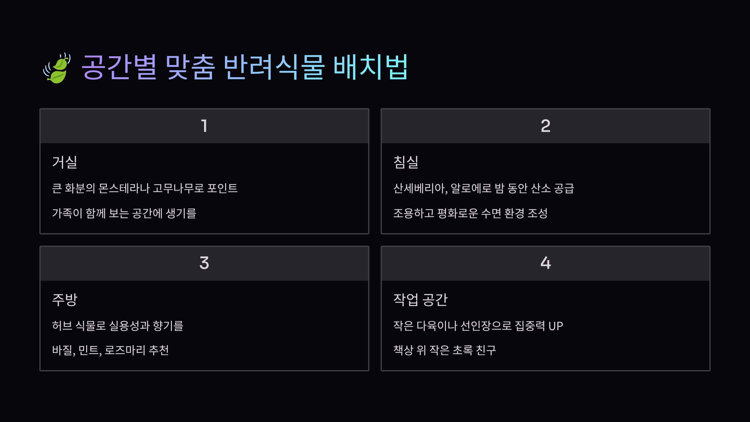 서재나 홈오피스에는 집중력을 높이는 식물이 좋아요. 선인장이나 다육식물은 관리가 쉽고 전자파 차단 효과가 있어서 컴퓨터 옆에 두기 좋답니다. 또한 페페로미아나 필로덴드론은 공기 정화 능력이 뛰어나면서도 책상 위 작은 공간에 두기 적합해요. 녹색 식물을 보면 눈의 피로가 줄어들어 장시간 작업에도 도움이 되죠.