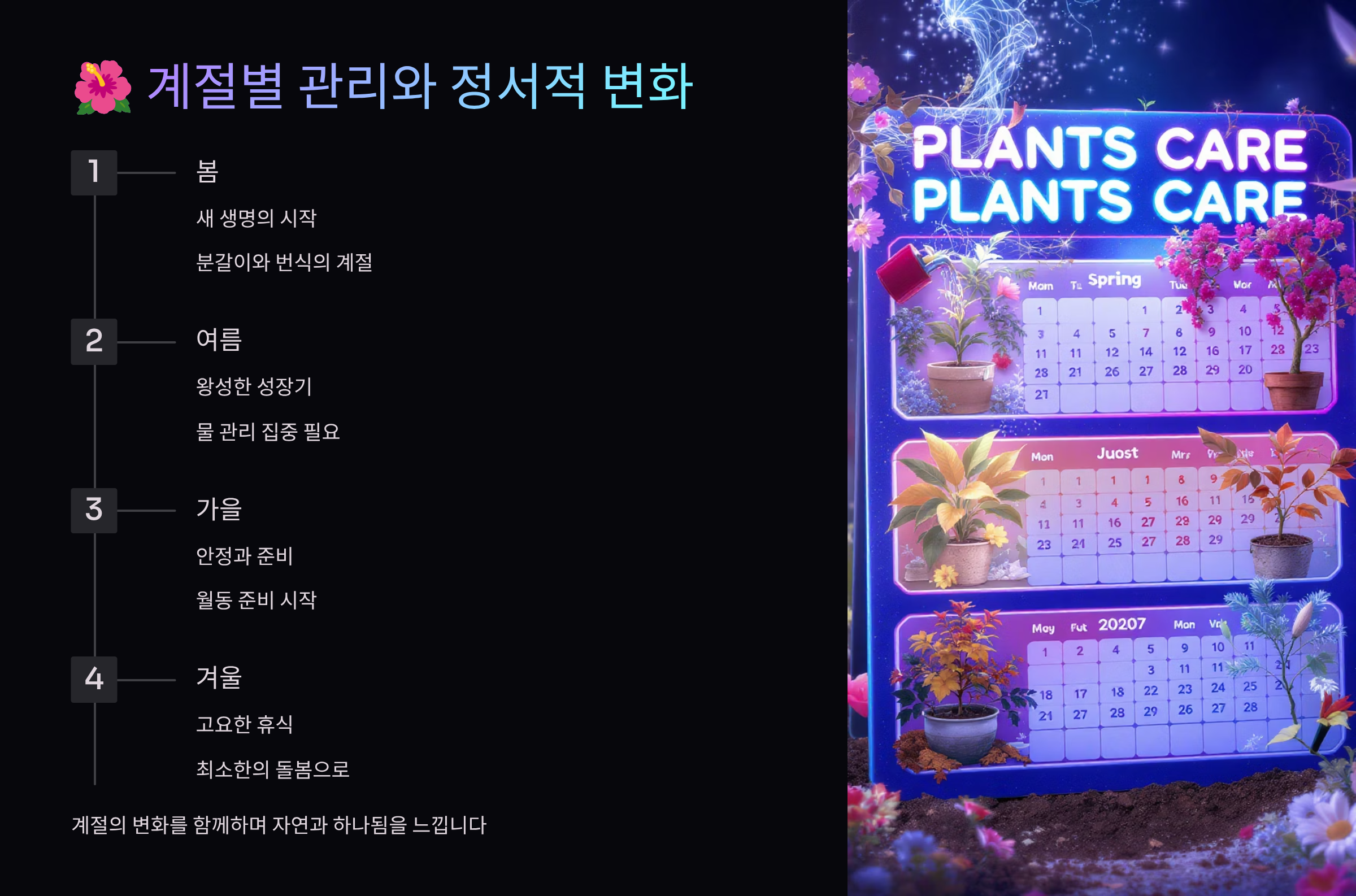 계절 변화에 따른 식물 관리는 우리에게 자연의 리듬을 가르쳐줘요. 봄의 설렘, 여름의 열정, 가을의 성숙, 겨울의 인내를 식물과 함께 경험하면서 정서적 안정감을 찾게 되죠. 일본의 한 연구에서는 계절에 맞춰 식물을 관리하는 사람들이 계절성 우울증을 덜 겪는다고 발표했어요.