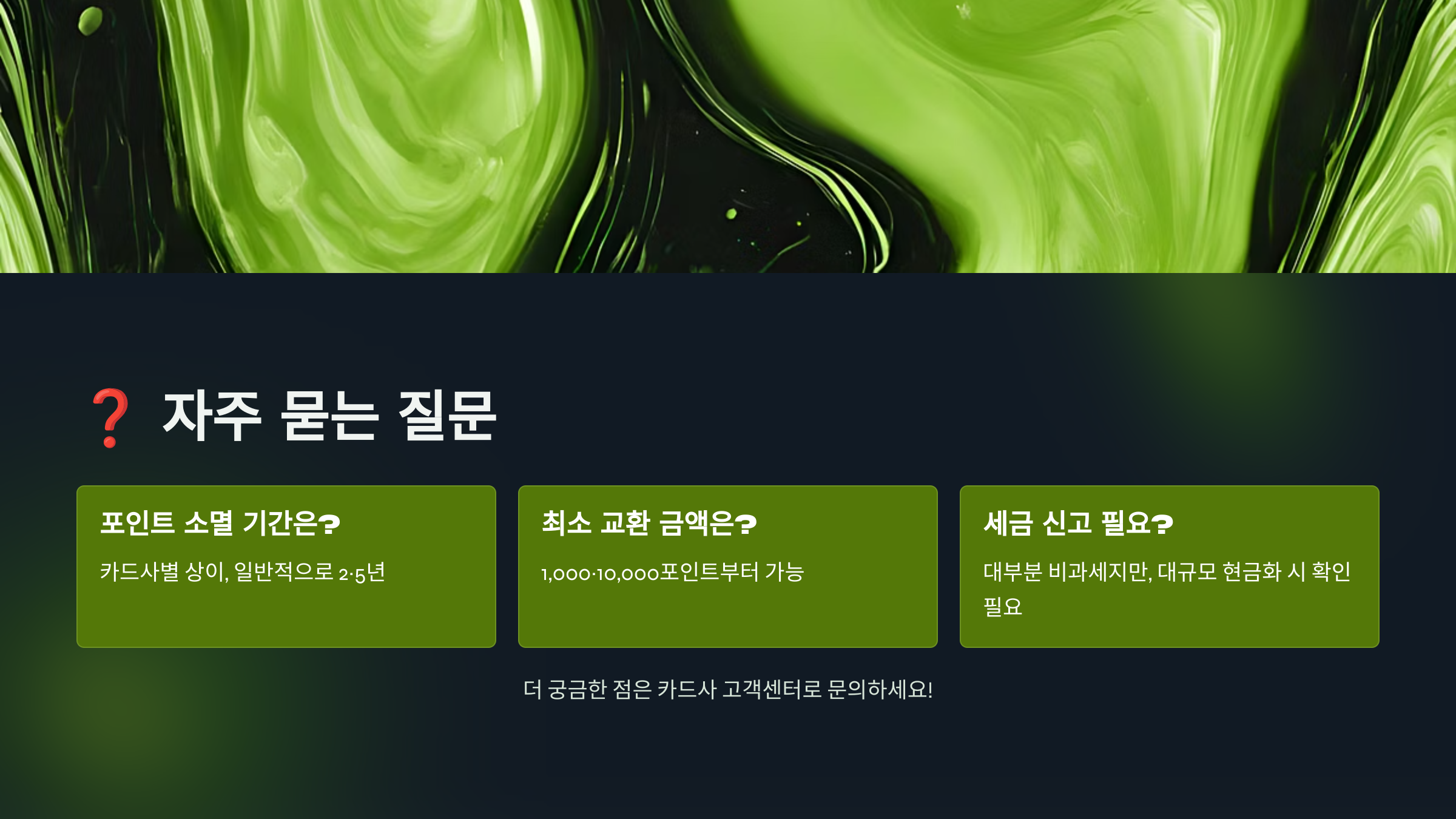 A8. 연말이나 카드사 창립기념일에 특별 이벤트를 많이 해요. 이때는 수수료 면제나 추가 포인트 제공 등의 혜택이 있답니다. 또한 포인트가 5만 점 이상 모였을 때 한 번에 전환하는 것이 수수료 면에서 유리해요! 🎯