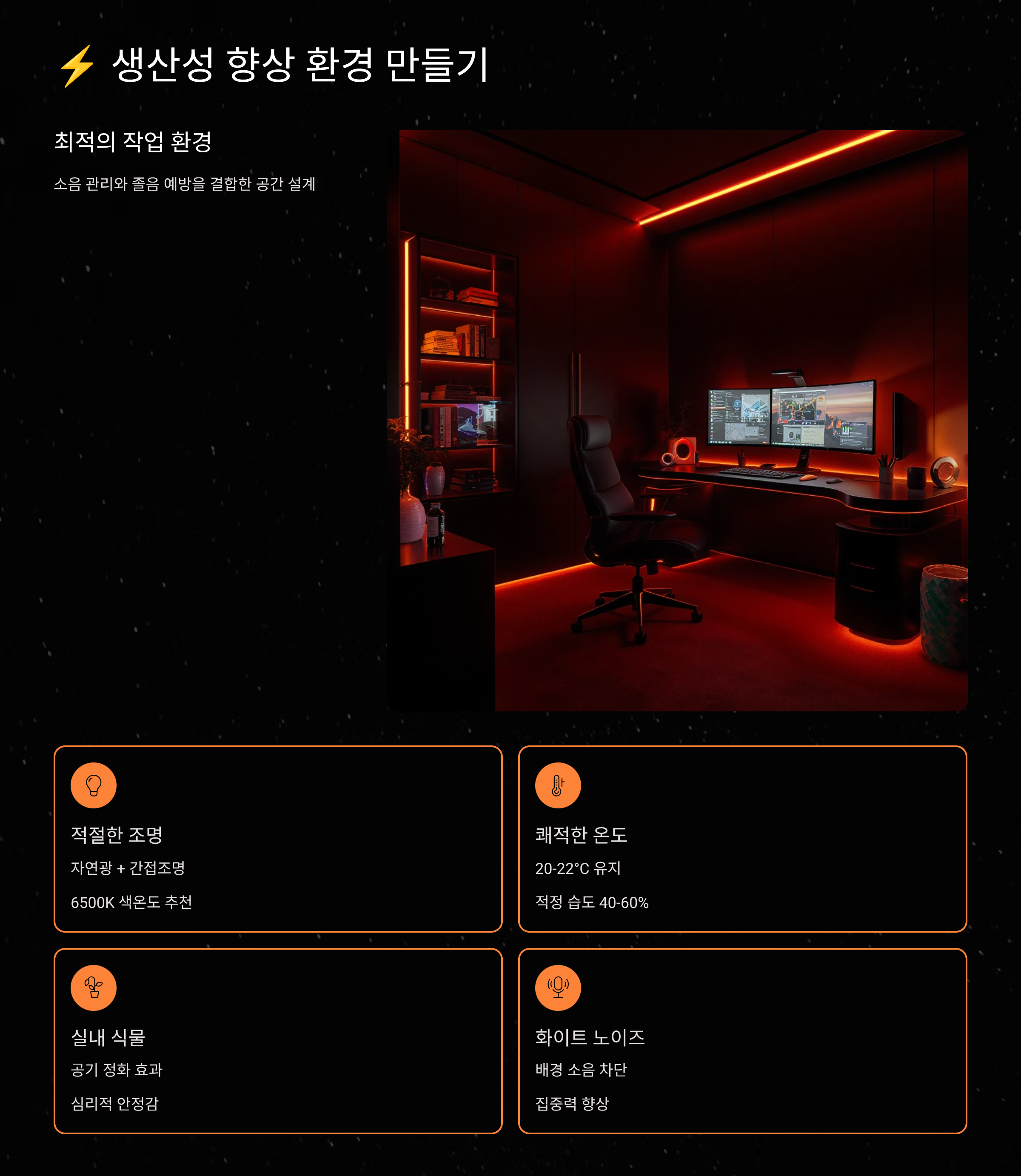생산성 높은 환경을 만들려면 조명, 온도, 습도, 소음 등 여러 요소를 종합적으로 관리해야 해요. 연구에 따르면 최적의 업무 환경은 조도 500-1000룩스, 온도 20-24도, 습도 40-60%, 소음 50dB 이하라고 해요. 이런 환경에서 집중력은 40% 향상되고, 실수는 25% 감소한다는 결과가 있답니다.