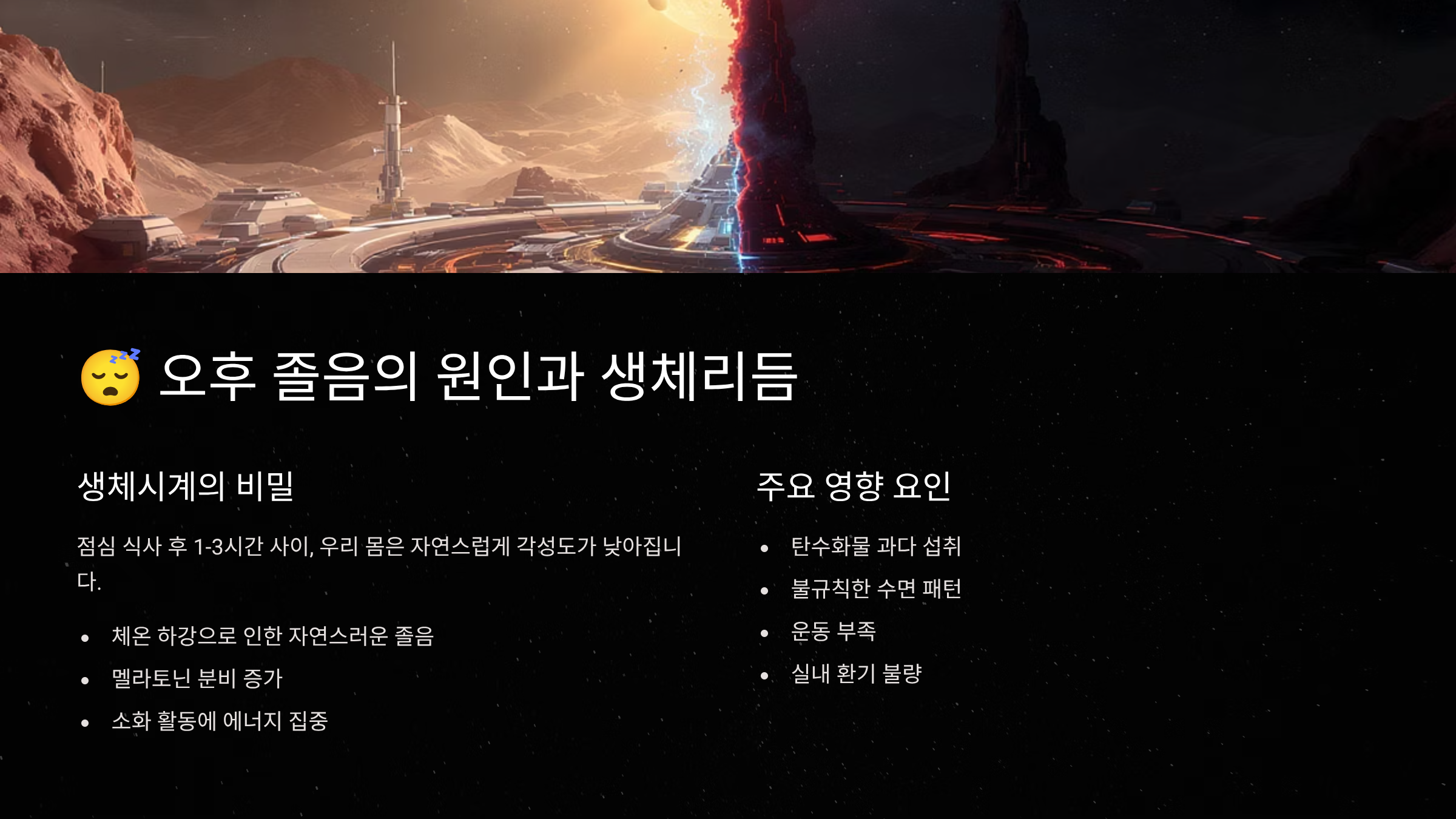 오후 졸음은 단순히 점심을 많이 먹어서 생기는 현상이 아니에요. 인간의 생체리듬, 즉 서카디안 리듬(Circadian Rhythm)과 깊은 관련이 있답니다. 우리 몸은 24시간 주기로 호르몬 분비와 체온 변화를 반복하는데, 오후 1시에서 3시 사이에 자연스럽게 각성도가 떨어지는 시간대가 있어요. 이를 '포스트런치 딥(Post-lunch dip)'이라고 부르죠.