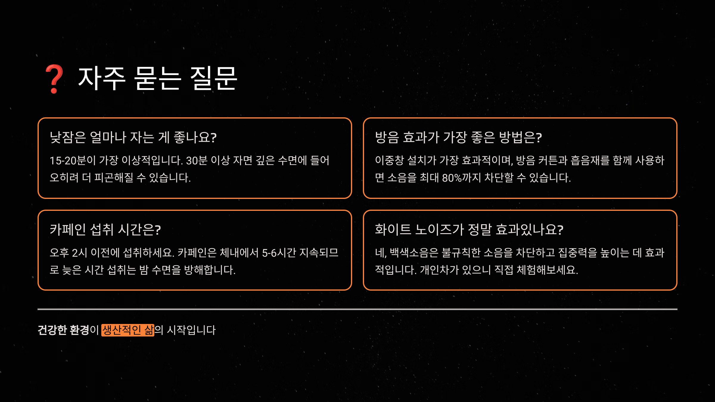 예방과 관리가 중요해요. 규칙적인 수면 습관을 만들고, 침실 환경을 최적화하며, 소음을 차단하는 것이 기본이에요. 필요하다면 수면 클리닉을 방문해서 전문적인 진단을 받는 것도 좋아요. 스마트워치나 수면 추적 앱을 활용해서 자신의 수면 패턴을 파악하는 것도 도움이 돼요. 건강한 수면과 조용한 환경은 투자가 아니라 필수라는 인식이 필요해요! 😴