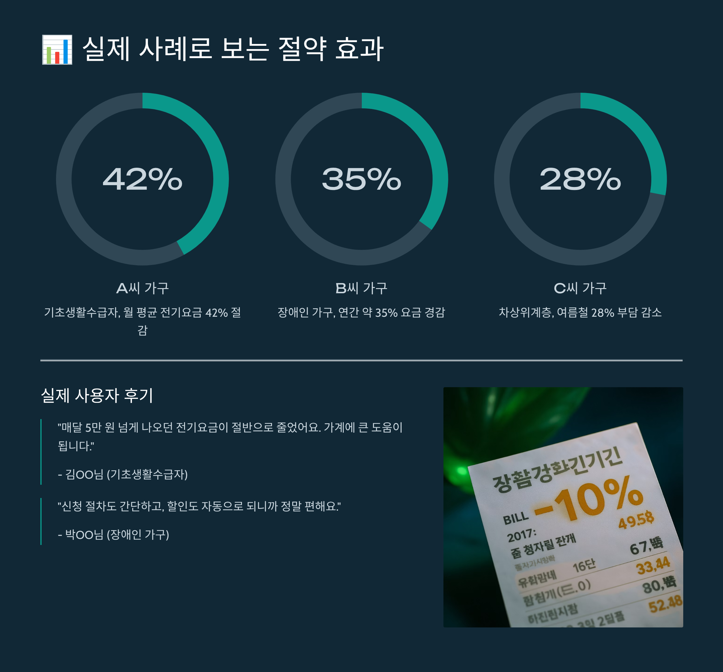 서울에 사는 김모 씨(45세) 가족의 이야기를 들려드릴게요. 4인 가족인 김 씨네는 기초생활수급자로 월평균 380 kWh의 전기를 사용하고 있었어요. 감면 신청 전에는 월 6만 5천 원의 전기요금을 내고 있었는데, 감면 후 4만 9천 원으로 줄었답니다. 월 1만 6천 원, 연간 19만 2천 원을 절약하게 된 거예요!