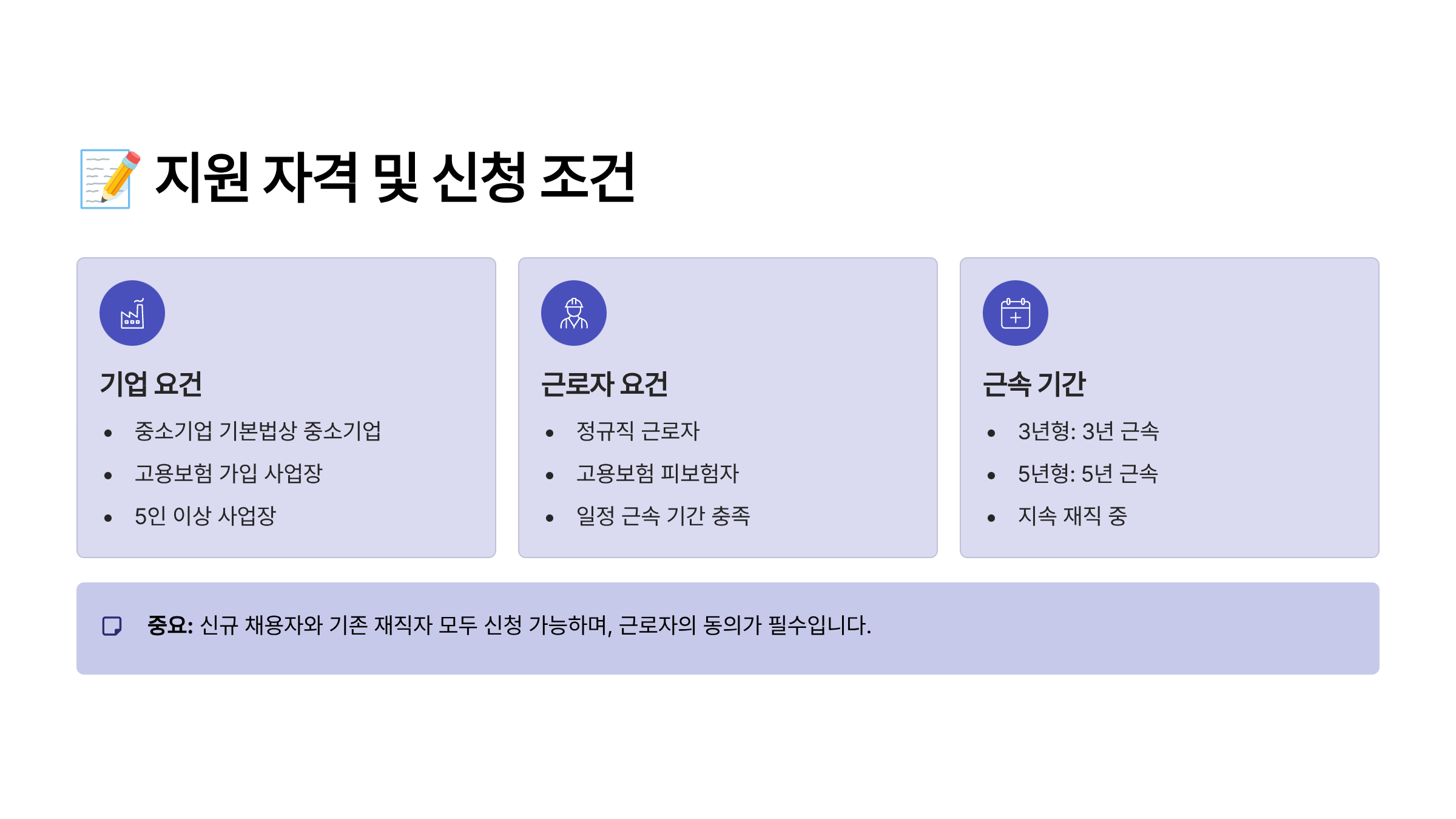 중소기업 장기근속자 지원금을 받기 위한 자격 조건이 2025년부터 대폭 완화되었어요! 기존에는 정규직만 가능했지만, 이제는 무기계약직과 1년 이상 근무한 계약직도 신청이 가능해졌답니다. 중소기업 범위도 확대되어 매출액 1,500억 원 이하 또는 상시 근로자 300명 이하 기업이면 모두 해당돼요. 벤처기업이나 이노비즈 인증 기업의 경우 규모와 상관없이 지원 대상에 포함된답니다.