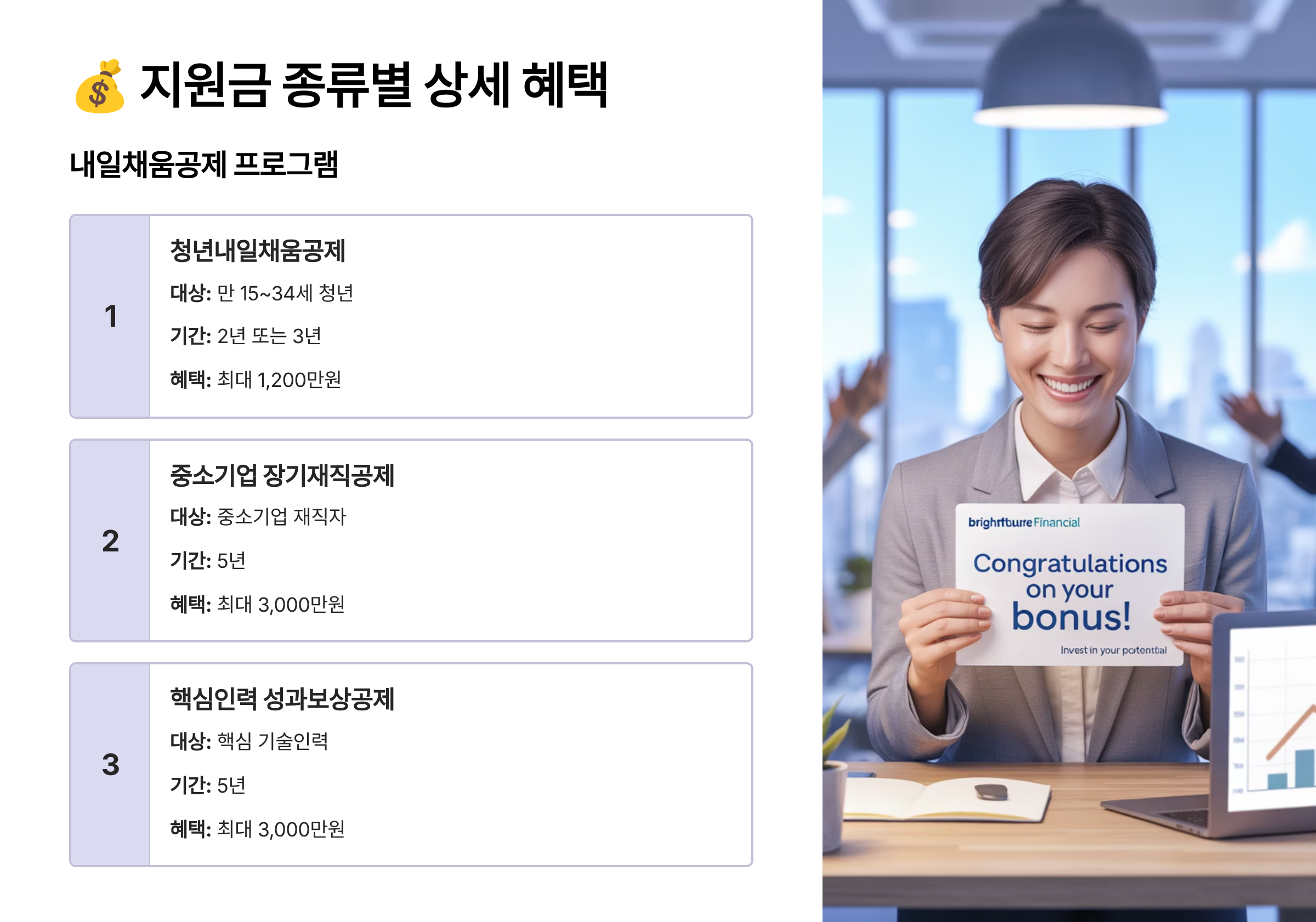 지원금의 핵심은 '공동적립' 방식이에요. 근로자가 매달 일정 금액을 적립하면, 기업과 정부가 함께 추가로 적립해 주는 방식이랍니다. 예를 들어, 근로자가 월 12만 원을 적립하면 기업이 20만 원, 정부가 추가 지원금을 더해서 총 40만 원 이상이 적립되는 구조예요. 5년 만기 시 최대 3,000만 원까지 목돈을 마련할 수 있답니다.