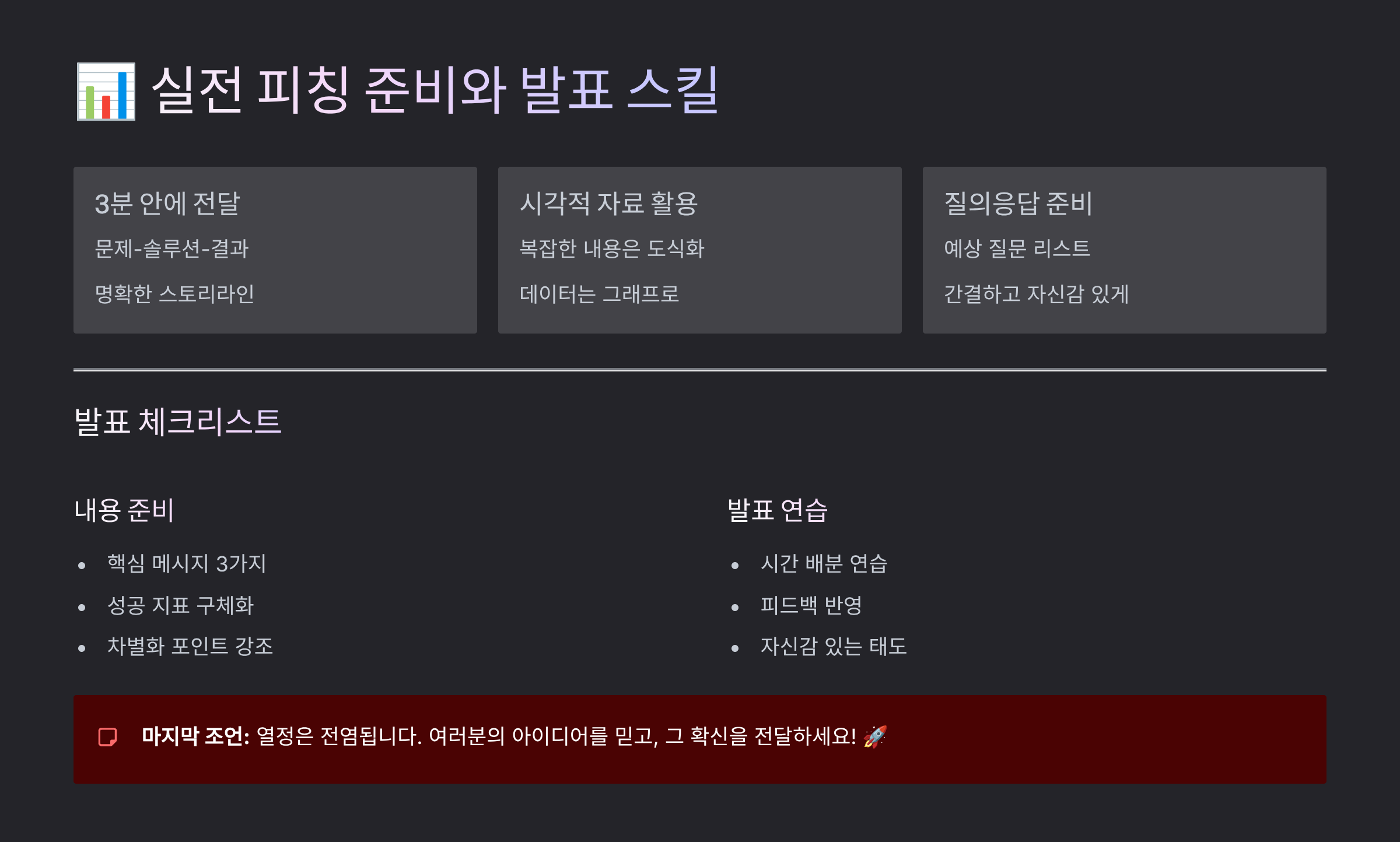 Q&A 대비는 필수예요! 예상 질문 30개 이상을 준비하고, 팀원들과 모의 질의응답을 해보세요. "경쟁사 대비 차별점은?" "수익은 언제부터 날 것 같나요?" "팀원 간 지분 배분은?" 같은 단골 질문들에 대한 답변을 준비하세요. 모르는 질문이 나오면 솔직하게 "좋은 지적이십니다. 추가로 검토해 보겠습니다"라고 답하는 게 낫답니다.