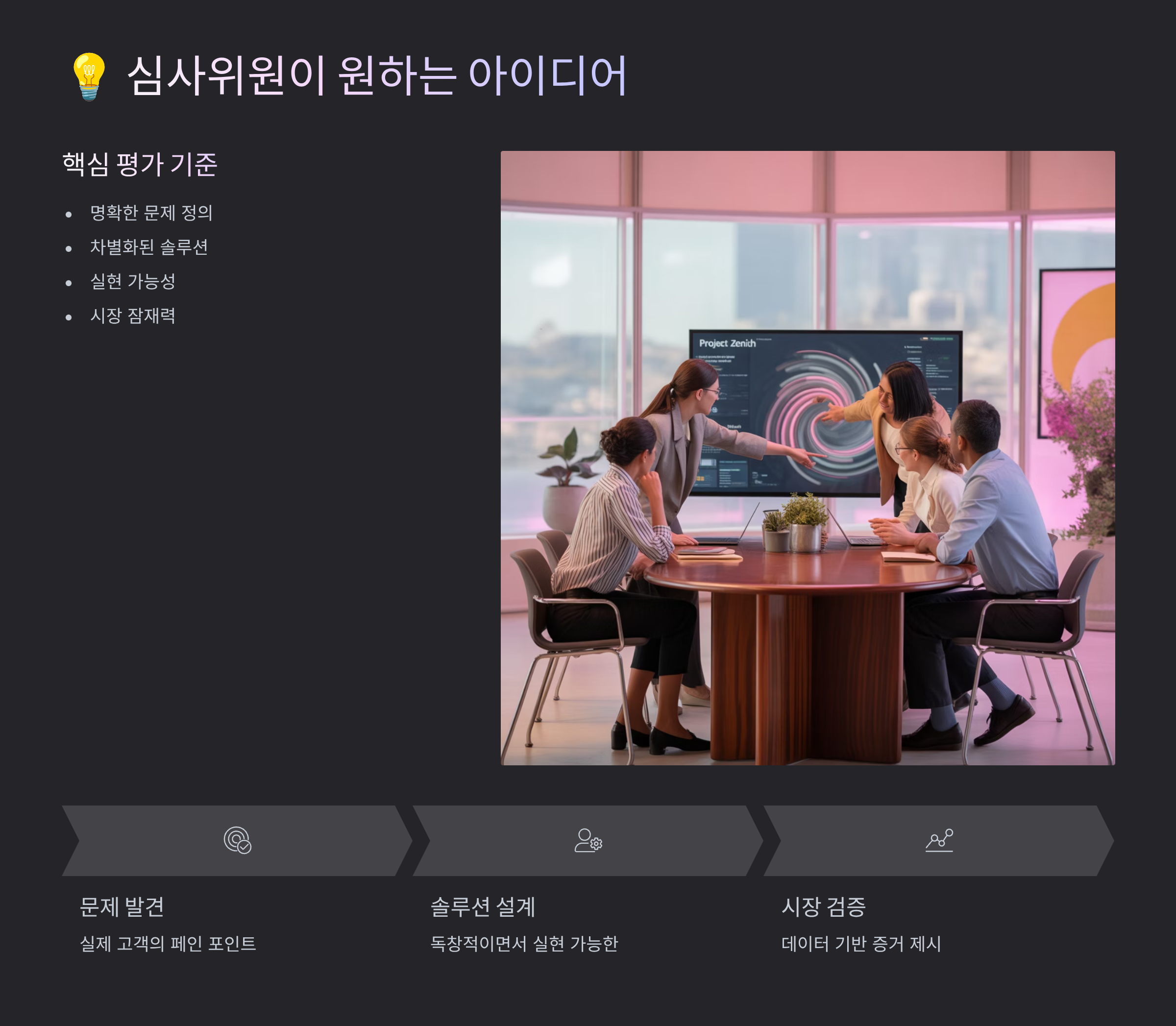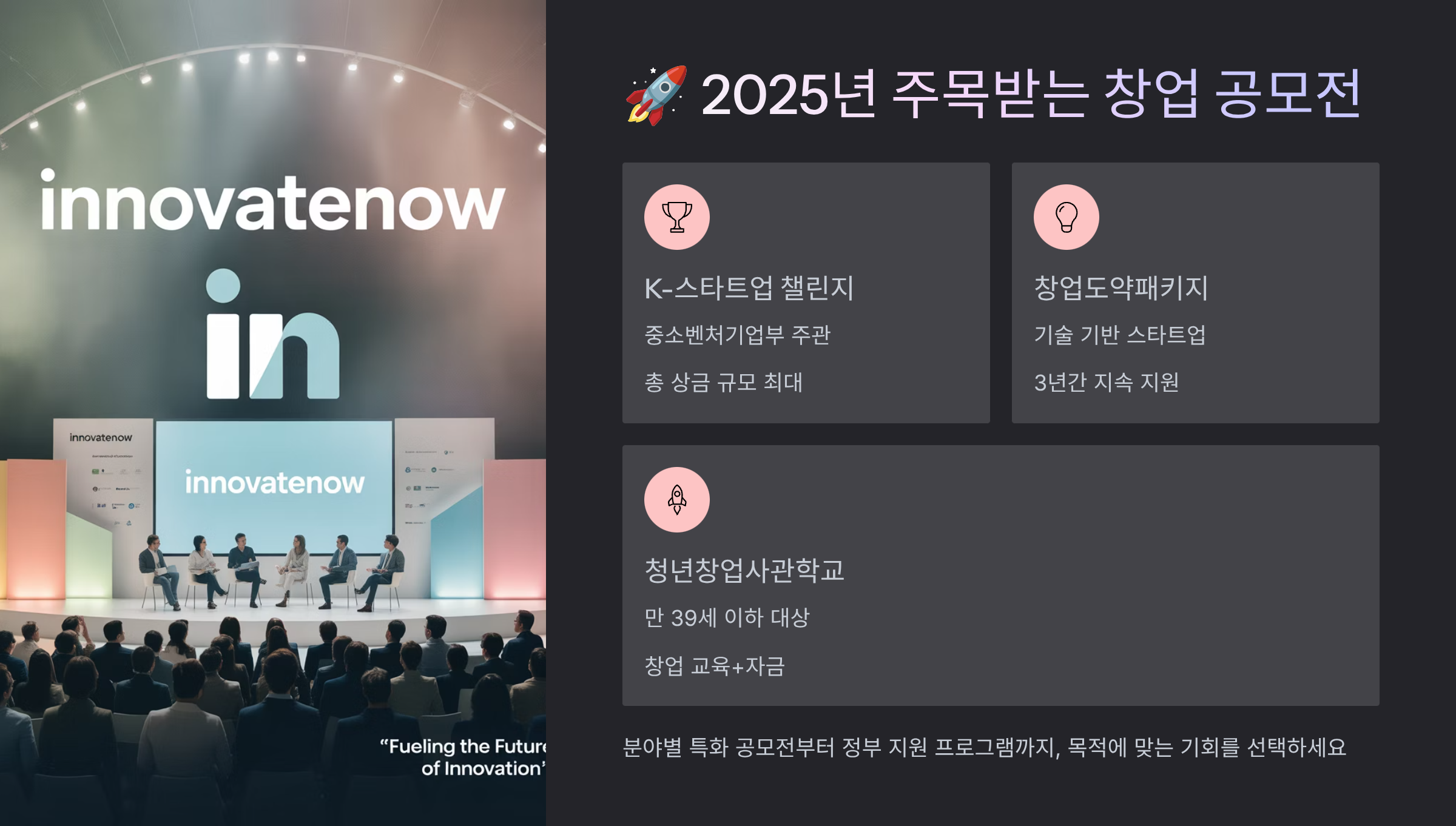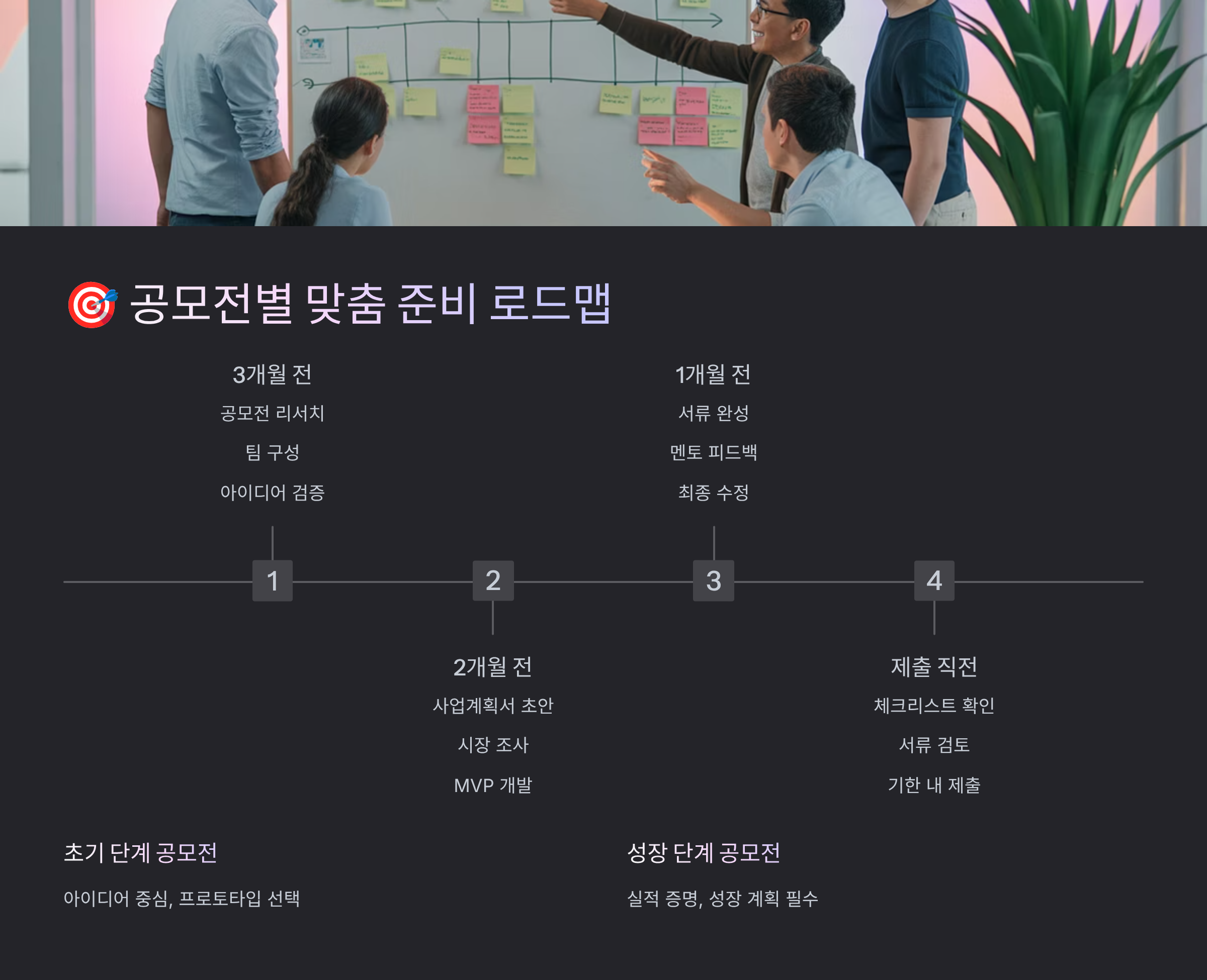 본 콘텐츠는 2025년 1월 기준으로 작성되었으며, 창업 공모전 관련 일반적인 정보를 제공하기 위한 목적으로 작성되었습니다. 실제 공모전 일정, 지원 자격, 심사 기준 등은 주최 기관의 공식 공고를 반드시 확인하시기 바랍니다. 정부 지원 사업의 경우 정책 변경에 따라 내용이 달라질 수 있으며, 투자 및 창업 결정은 개인의 판단과 책임 하에 이루어져야 합니다.