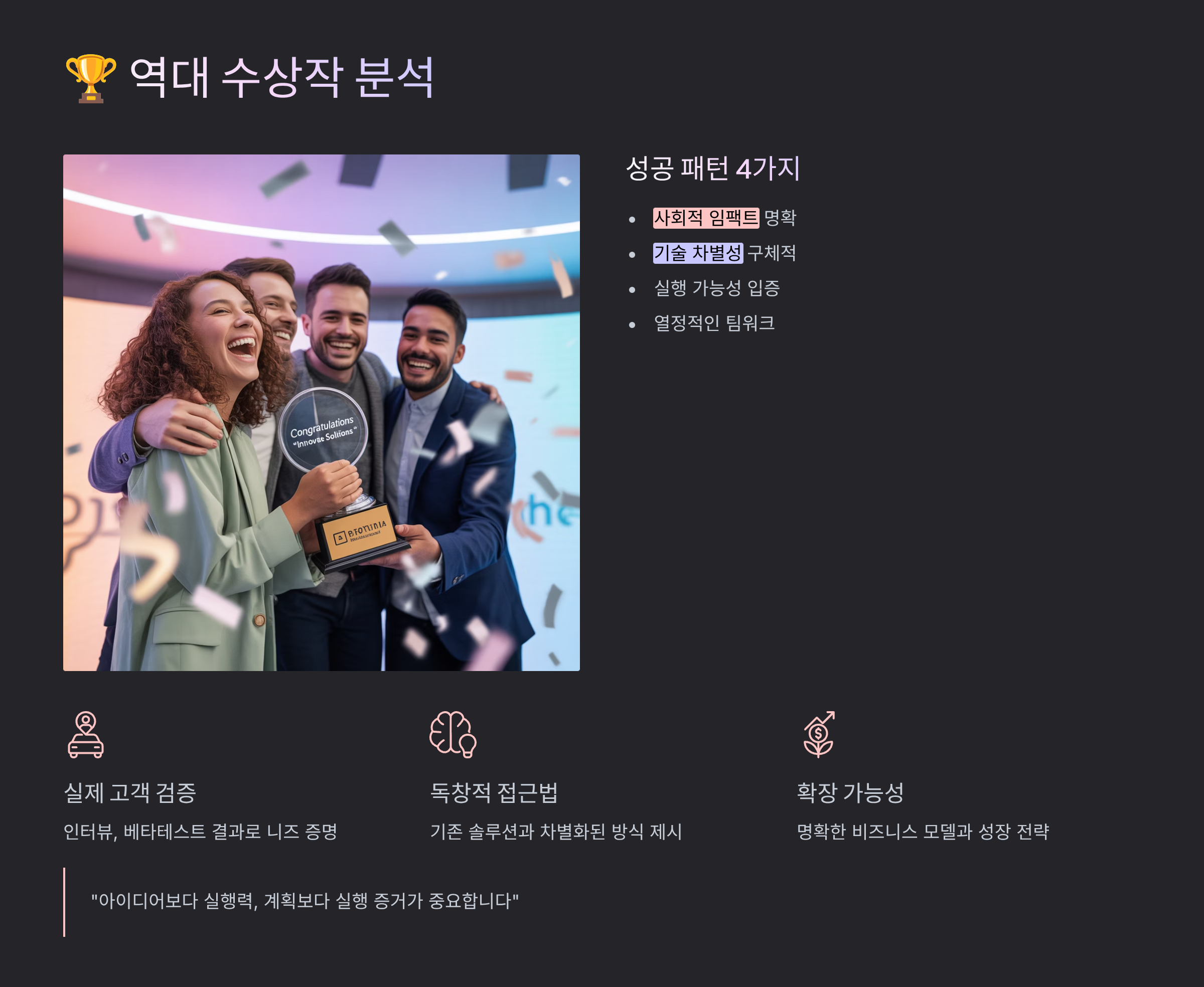 역대 창업 공모전 수상작들을 분석해 보면 흥미로운 패턴이 보여요. 2024년 도전! K-스타트업 대상을 받은 '에이아이댑스'는 AI 기반 신약 개발 플랫폼으로, 기존 10년 걸리던 신약 개발 기간을 3년으로 단축시킨다는 명확한 가치를 제시했어요. 기술의 혁신성도 중요하지만, 그것이 가져올 실질적 변화를 구체적으로 보여준 것이 주효했답니다.
