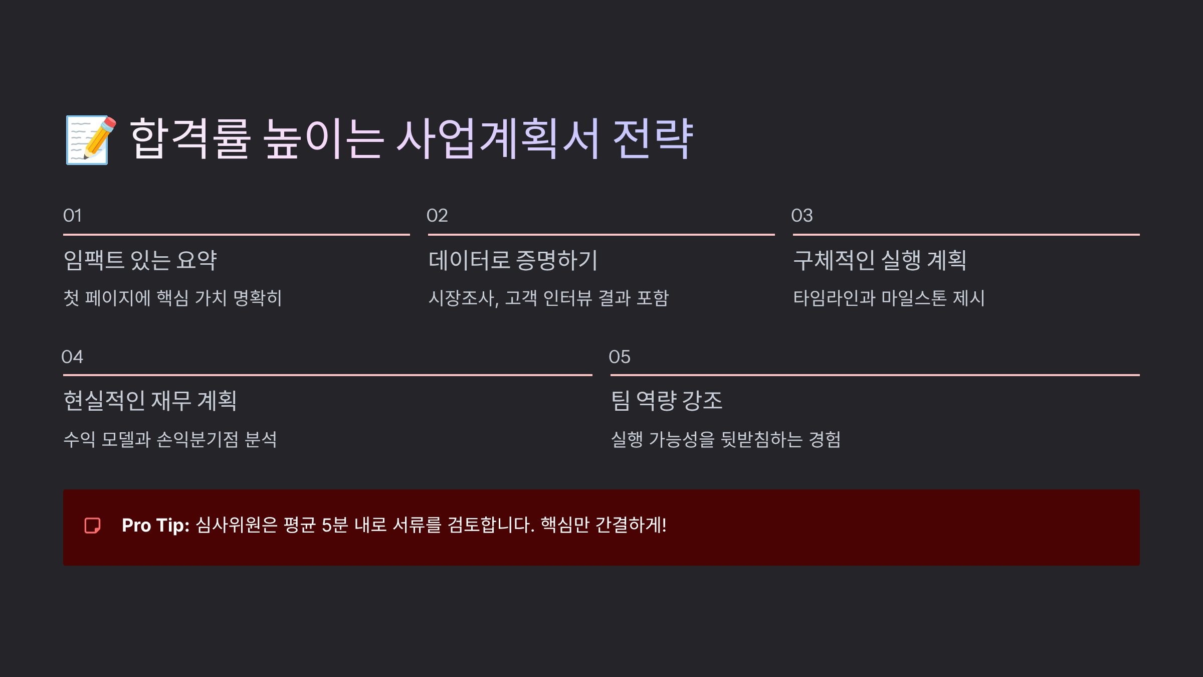 사업계획서의 첫 페이지가 승부를 결정해요. 심사위원들은 수십, 수백 개의 계획서를 검토하기 때문에 첫인상이 정말 중요해요. 엘리베이터 피치처럼 한 문장으로 여러분의 비즈니스를 설명할 수 있어야 해요. "우리는 [타깃]을 위한 [설루션]을 제공하는 [카테고리]입니다" 형식으로 정리해 보세요. 예를 들어 "우리는 1인 가구를 위한 소량 식재료 배송 서비스입니다"처럼요.