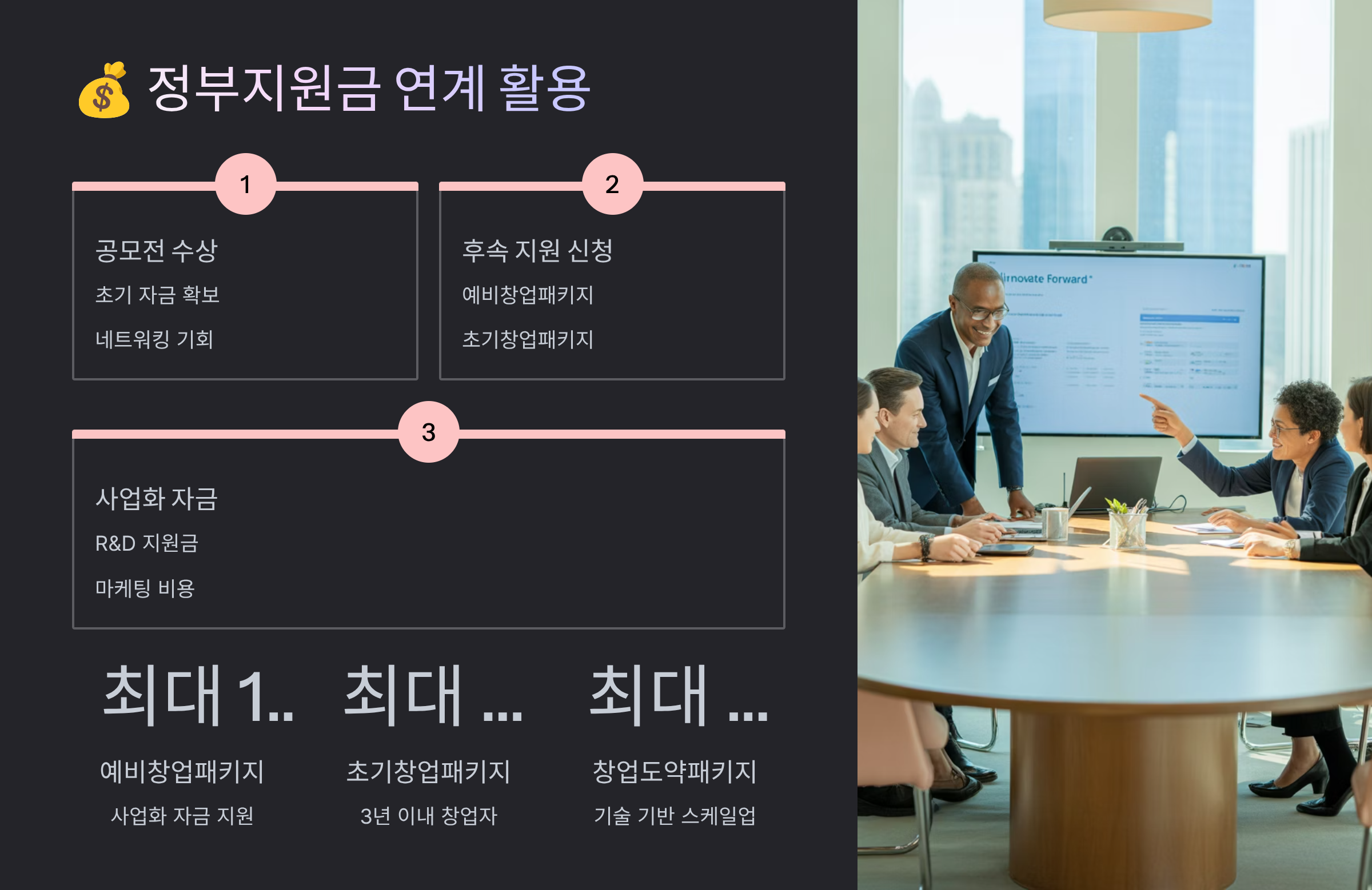 창업 공모전 수상은 정부 지원 사업의 문을 여는 열쇠예요. 많은 정부 지원 프로그램이 공모전 수상 경력을 가산점으로 인정해요. 예비창업패키지의 경우 공모전 수상자는 서류 평가에서 최대 5점의 가산점을 받을 수 있어요. 이는 합격률을 크게 높여주는 요소랍니다. 중기부, 과기부, 문체부 등 각 부처별로 다양한 지원 사업이 있으니 꼼꼼히 살펴보세요.