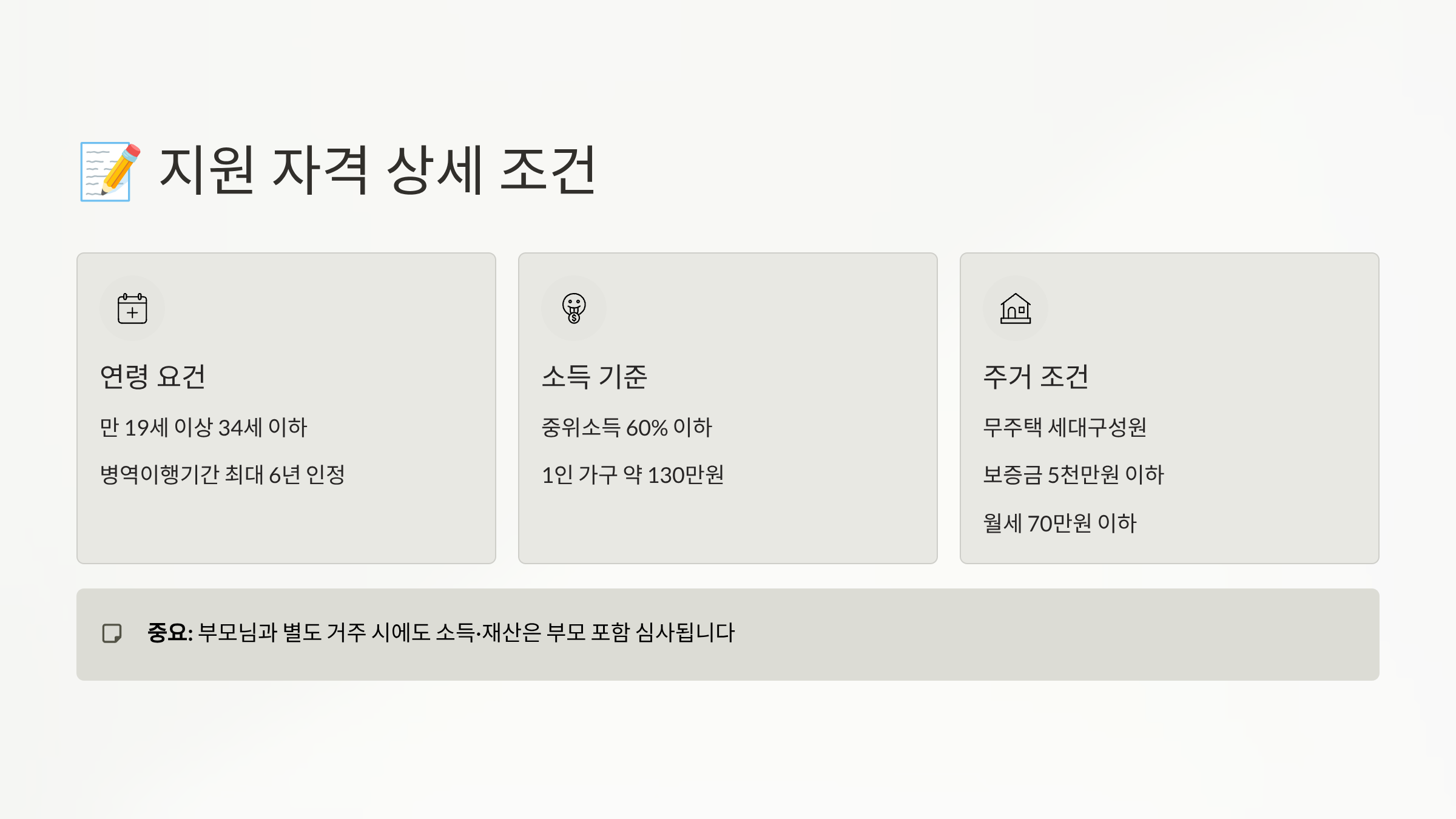 자격 조건 중에서 가장 많이 탈락하는 부분이 소득 기준이에요. 특히 부모님의 소득을 합산하다 보니 기준을 초과하는 경우가 많거든요. 하지만 부모님이 실직 상태이거나 은퇴하신 경우, 또는 기초생활수급자인 경우에는 별도의 심사를 통해 지원받을 수 있는 경우도 있어요. 포기하지 말고 상담을 받아보는 것을 추천드려요!