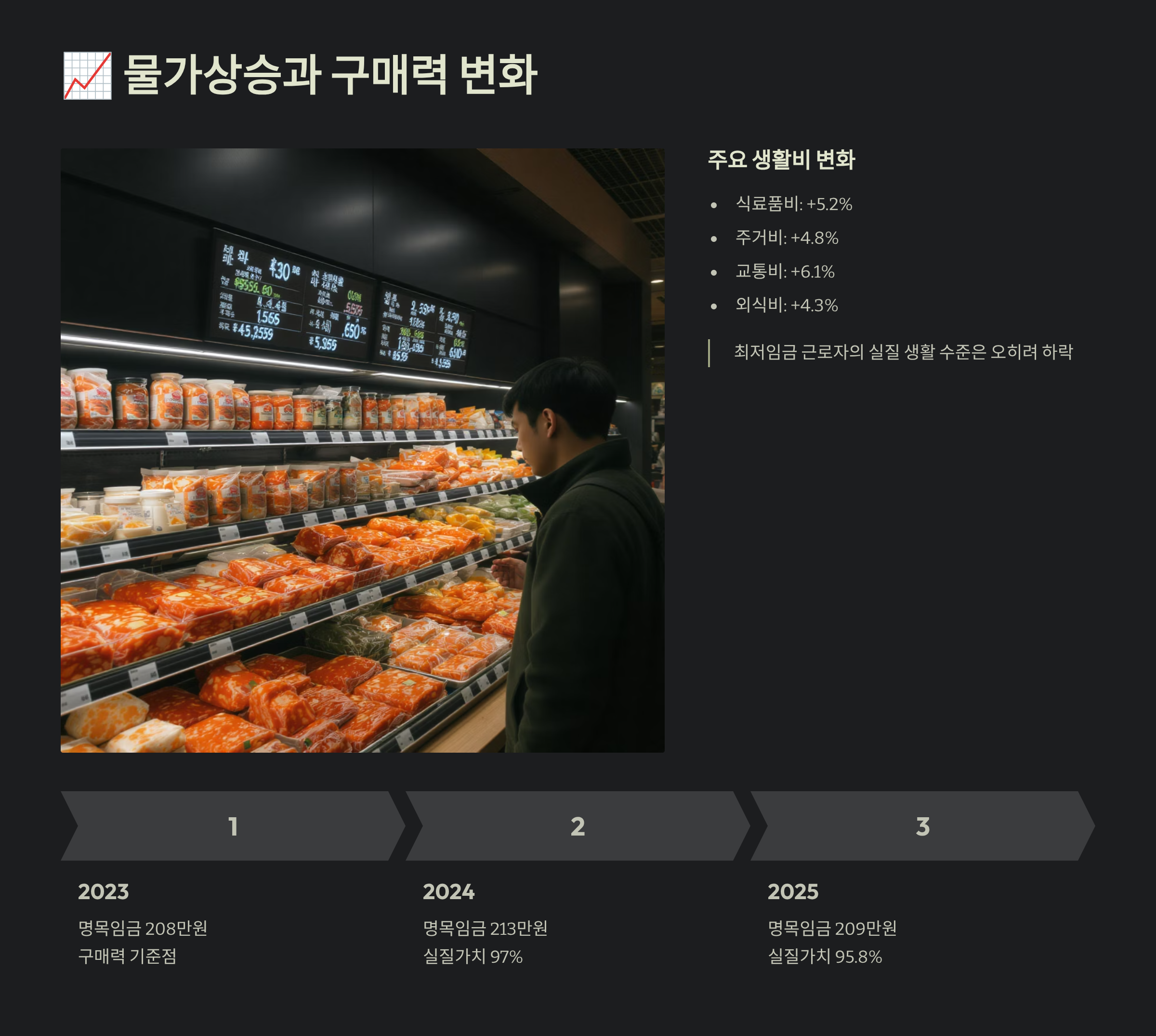 A1. 2025년 최저임금은 1.7% 인상되었지만 물가상승률 2.1%를 고려하면 실질임금은 오히려 0.4% 감소했어요. 월 35,530원 인상되었지만 물가 상승분을 제하면 실제 구매력은 떨어진 셈이랍니다. 특히 식료품과 주거비 상승이 크게 작용했어요.