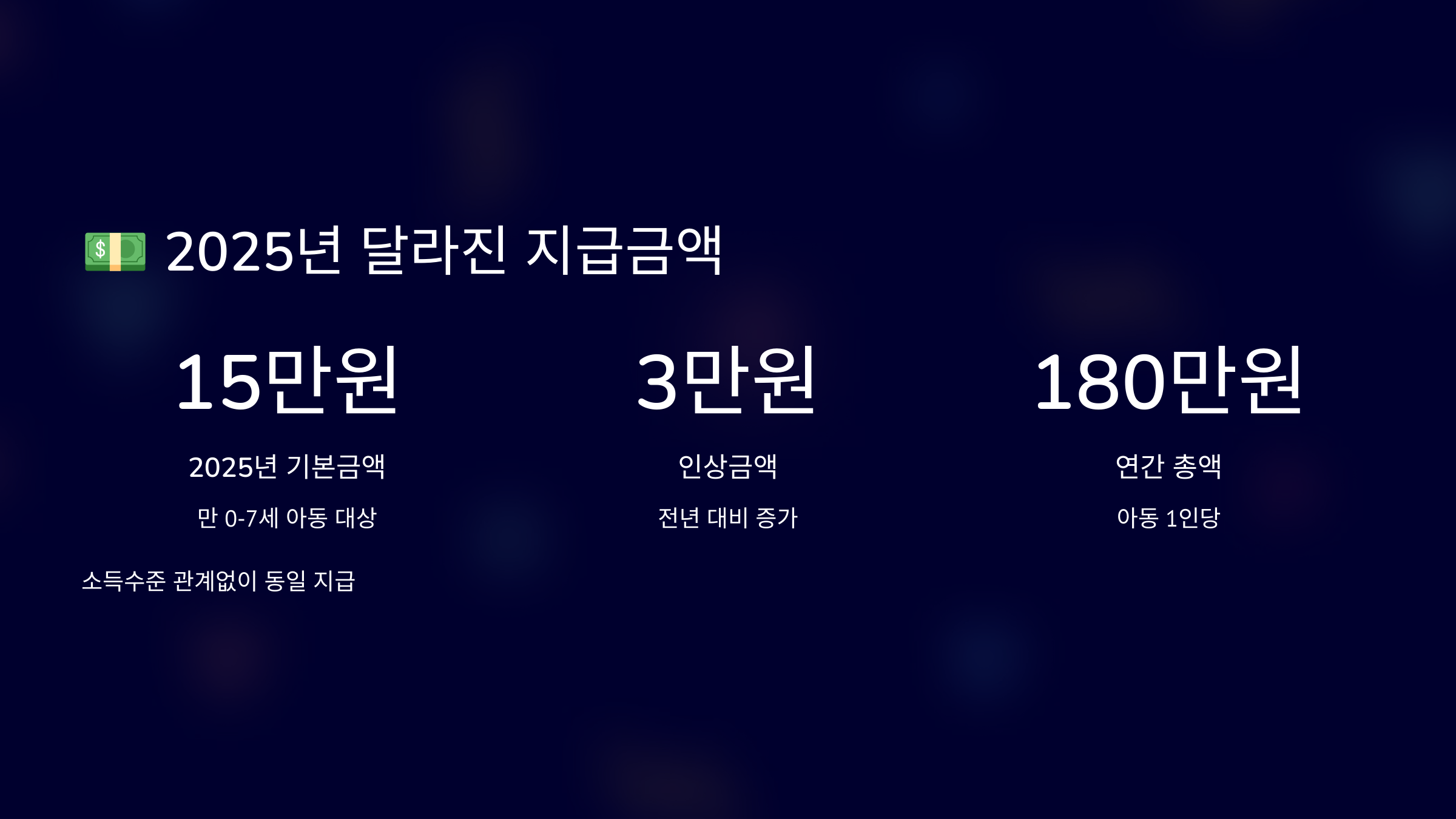 2025년부터는 첫째 아이와 둘째 아이 구분 없이 동일하게 10만 원씩 지급돼요. 다자녀 가정의 경우 아이 수만큼 받을 수 있답니다. 예를 들어 만 8세 미만 자녀가 3명이면 매달 30만 원을 받게 되는 거죠. 육아 비용 부담이 큰 다자녀 가정에게는 정말 큰 도움이 될 거예요.
