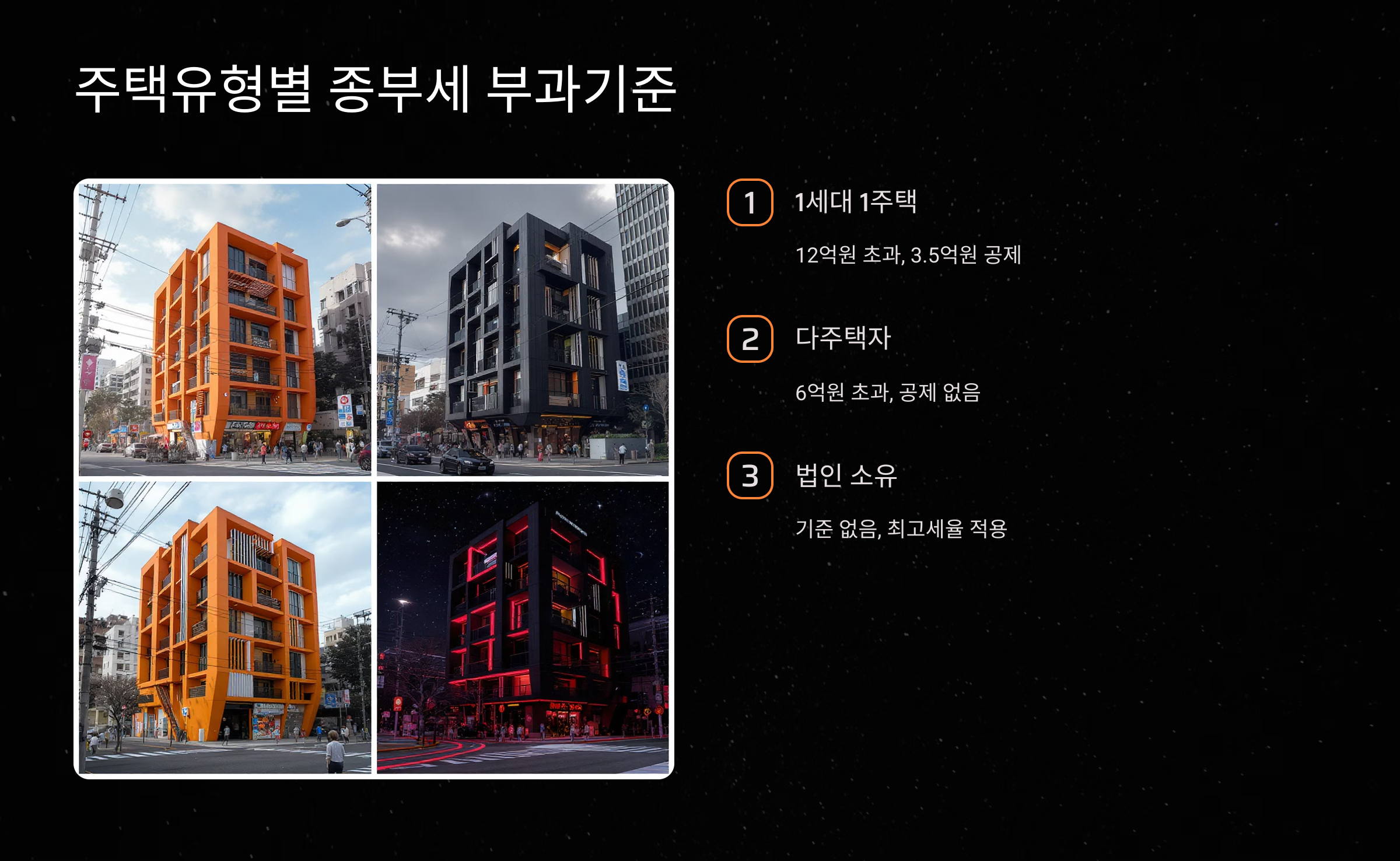 주택 유형에 따라 종부세 부과기준이 다르다는 사실, 알고 계셨나요? 일반 아파트와 단독주택, 다가구주택, 오피스텔 등 각각의 특성에 맞는 과세 기준이 적용돼요. 특히 2025년부터는 주거용 오피스텔도 주택 수에 포함되어 종부세 과세 대상이 되었답니다. 이는 주거 목적으로 사용되는 모든 부동산에 대해 공평한 과세를 하겠다는 정부의 의지가 반영된 거예요.